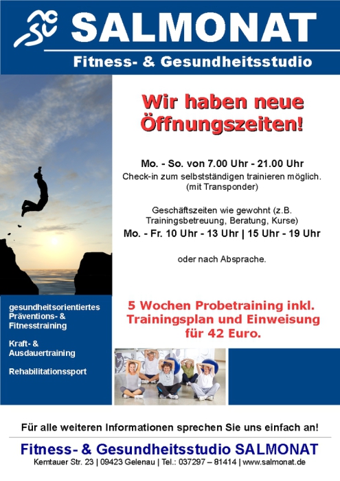 Fitness & Gesundheitsstudio Salmonat Kemtauer Str. 23 09423 Gelenau Telefon: 037297 81414